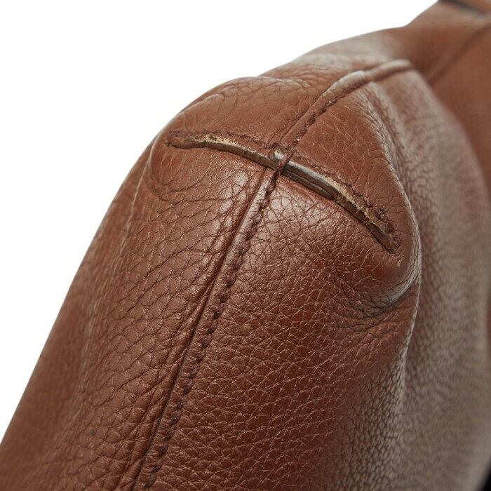外側: スレ、キズ、全体的に塗り、ファスナーポケット内に汚れ、ペン跡 サイド、コバひび割れ 底面、角スレ ショルダー、スレ、金具跡、塗り 金具、変色、くすみ、メッキはがれ 開閉口、コバに亀裂 内側、汚れ、変色、ペン跡、若干の破れ
