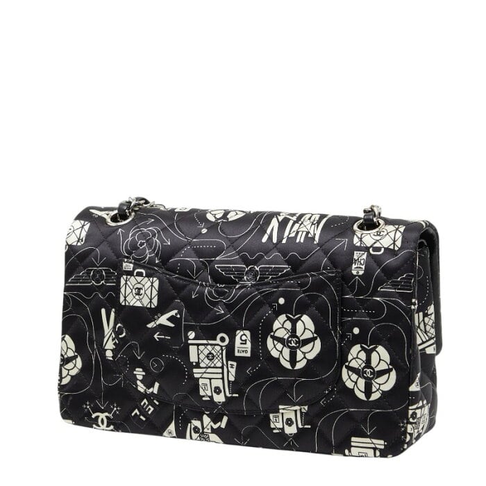 シャネル エアライン マトラッセ25 ダブルフラップ チェーンショルダーバッグ ブラック ホワイト サテン レザー レディース CHANEL 【中古】