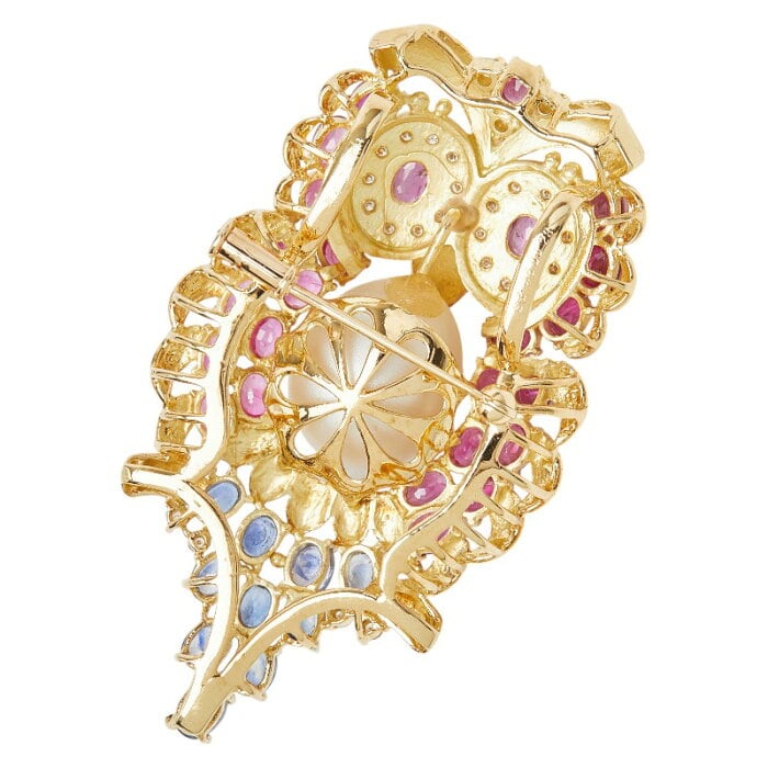 真珠 K18YG イエローゴールド ダイヤ0.28ct 白蝶真珠11.8×13.2mm ルビー4.30ct サファイア2.45ct 南洋パール ふくろうモチーフ ペンダントトップ ブローチ レディース 【中古】