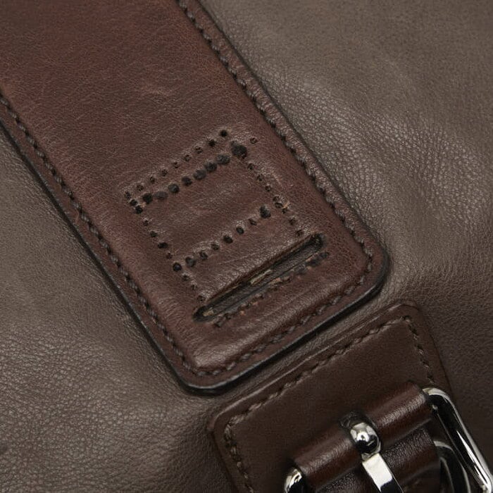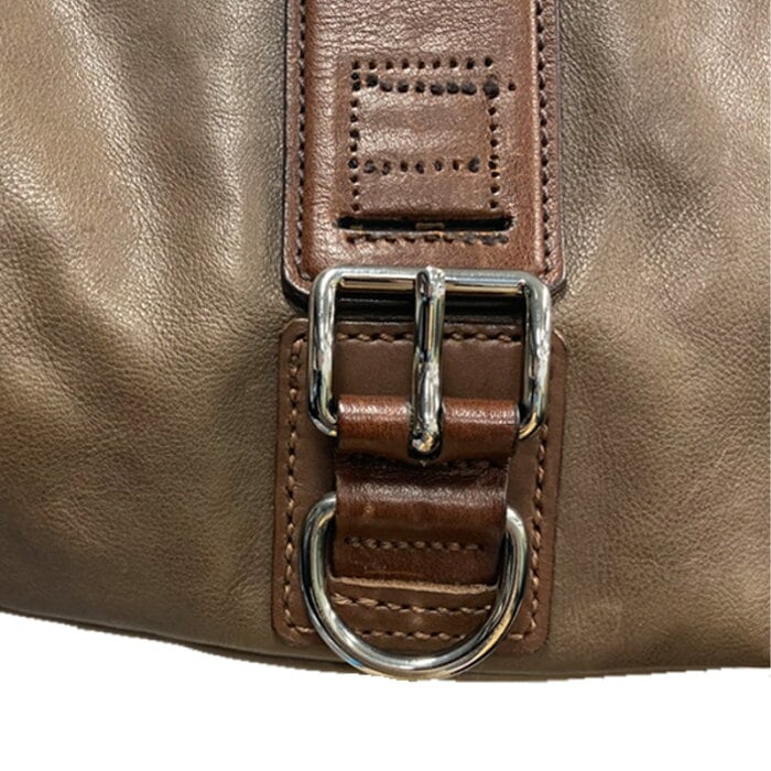 外側: キズ、汚れ サイド、コバひび割れ 底面、角スレ ショルダー、穴増設あり、汚れ 金具、キズ フラップ、付け根、コバひび割れ、汚れ 開閉口、スレ、ベルト金具が改造されており、閉まらない 内側、スレ、糸ほつれ、シミ