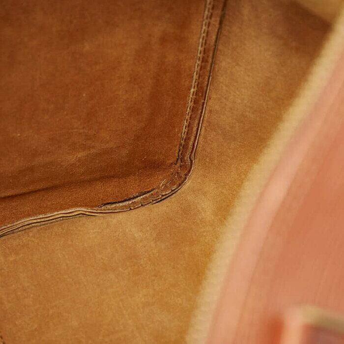 外側: スレ、キズ、汚れ、たたみジワ 底面、角スレ ハンドル、スレ、キズ、汚れ、コバに亀裂 金具、変色、僅かに緑青サビ、ファスナーに若干のメッキはがれ 内側、スレ、薄汚れ