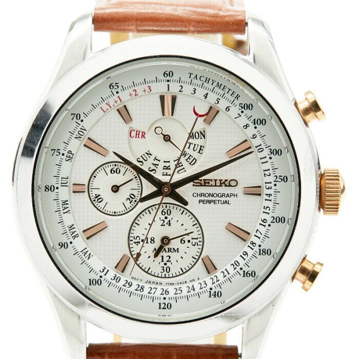 セイコー アラーム パーペチュアル クロノグラフ 腕時計 7T86-0AC0(SPC129P) 日本製クオーツ ホワイト文字盤 ステンレススチール メンズ SEIKO 【中古】