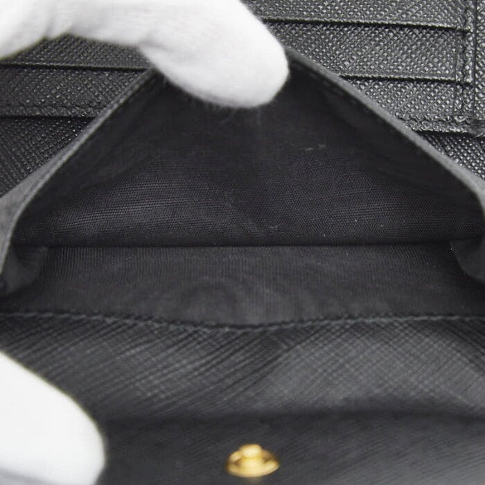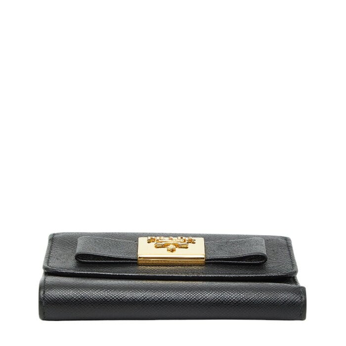 プラダ ロゴ リボン 三つ折り財布 ブラック ゴールド サフィアーノレザー レディース PRADA 【中古】