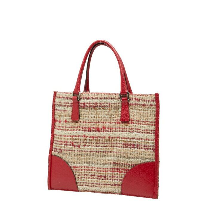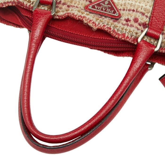 プラダ 三角ロゴプレート ニット トートバッグ ハンドバッグ レッド ベージュ ウール レザー レディース PRADA 【中古】