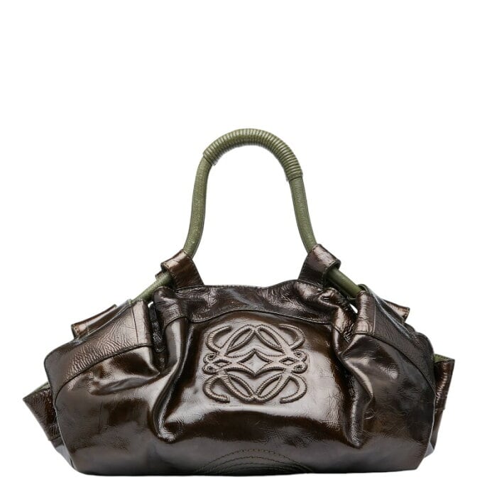 ロエベ アナグラム ナッパアイレ ハンドバッグ ブラウン グリーン パテントレザー レザー レディース LOEWE 【中古】