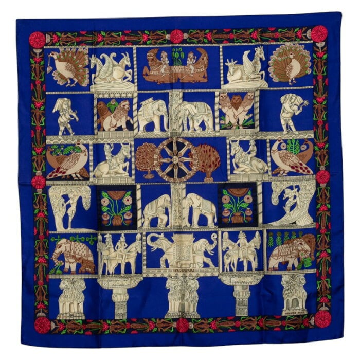 エルメス カレ90 TORANA 塔門 スカーフ ブルー マルチカラー シルク レディース HERMES 【中古】