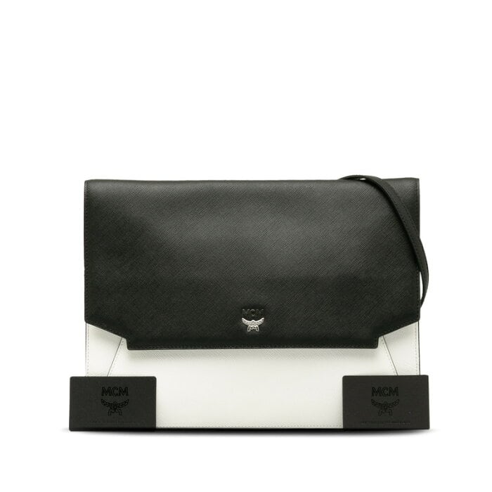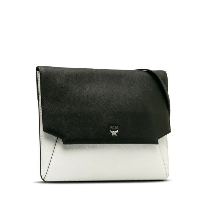 エム シー エム フラット ショルダーバッグ ブラック ホワイト レザー レディース MCM 【中古】