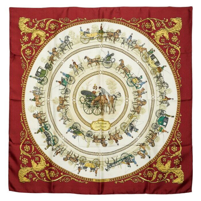 エルメス カレ90 LA PROMENADE DE LONGCHAMPS ロンシャンへの散歩 スカーフ レッド マルチカラー レディース HERMES 【中古】