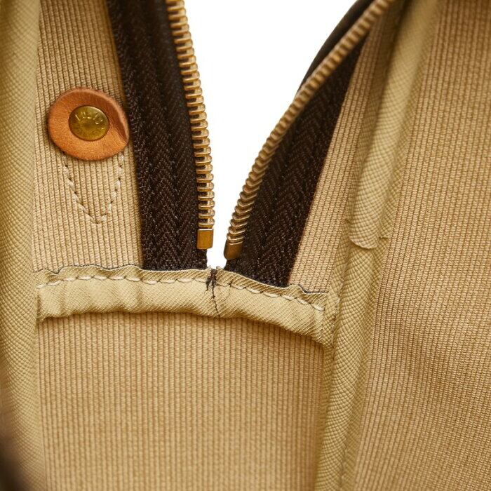 外側: レザーとパイピングにスレ・シミ・変色、オープンポケット内に僅かな汚れ、糸切れ、角スレ、スレ・色あせ、レザー部分に若干の亀裂、変色・メッキはがれ
