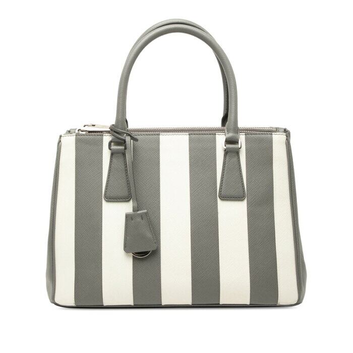 プラダ ガレリア ミディアム ストライプ ハンドバッグ 1BA863 グレー ホワイト サフィアーノレザー レディース PRADA 【中古】