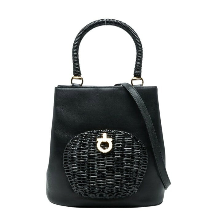 サルヴァトーレフェラガモ ガンチーニ ハンドバッグ ショルダーバッグ 2WAY ブラック ゴールド レザー ラタン レディース Salvatore Ferragamo 【中古】
