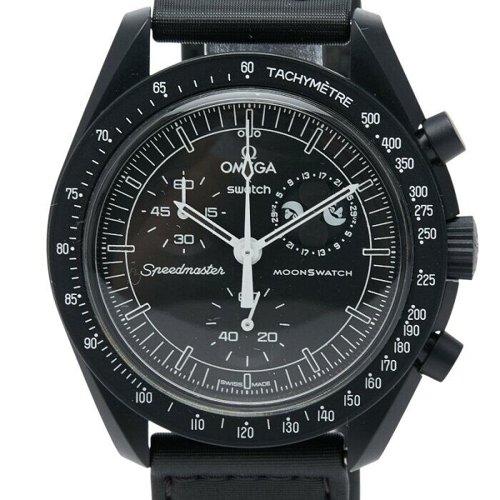 オメガ スウォッチ 65周年コラボレーション スヌーピー スピードマスター ミッション トゥ ザ ムーンフェイズ エディション 腕時計 SO33B700 クオーツ ブラック文字盤 バイオセラミック メンズ OMEGA 【中古】