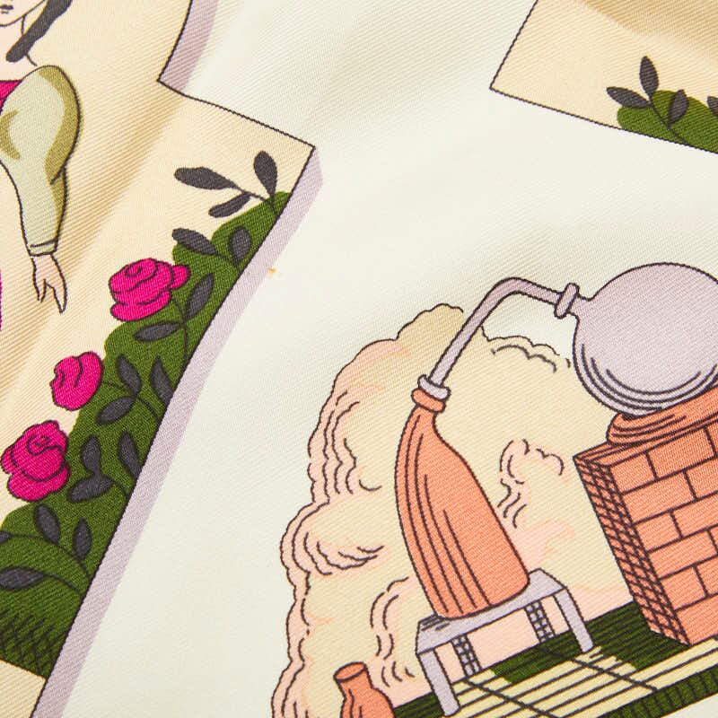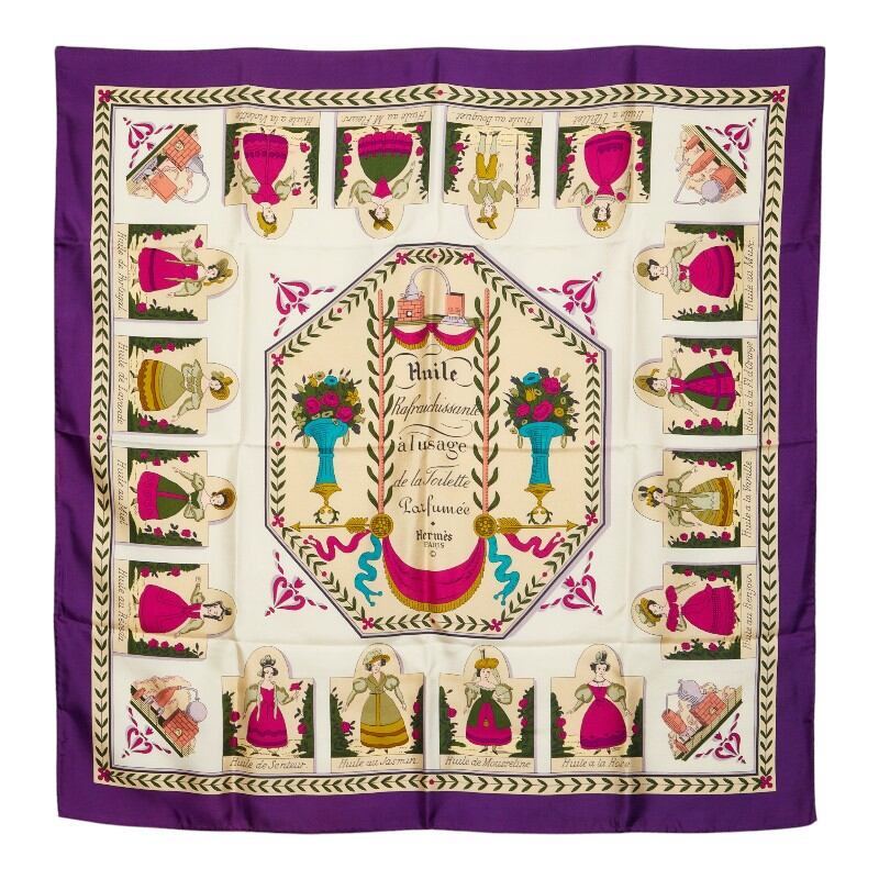 エルメス カレ90 Huile Rafraichissante l'Usage de la Toilette Parfume 花の植生 スカーフ パープル ホワイト マルチカラー シルク レディース HERMES 【中古】