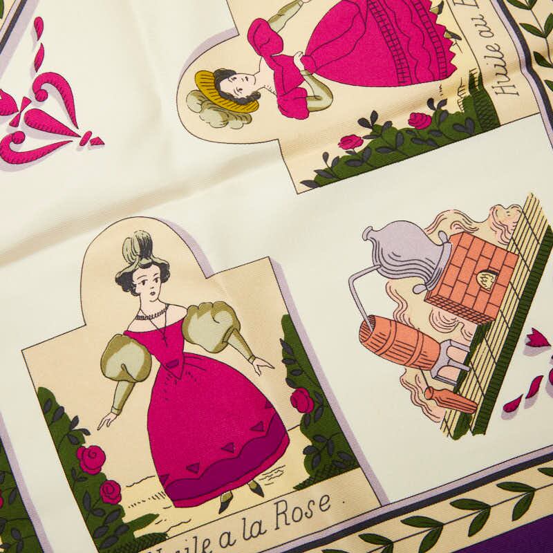 エルメス カレ90 Huile Rafraichissante l'Usage de la Toilette Parfume 花の植生 スカーフ パープル ホワイト マルチカラー シルク レディース HERMES 【中古】