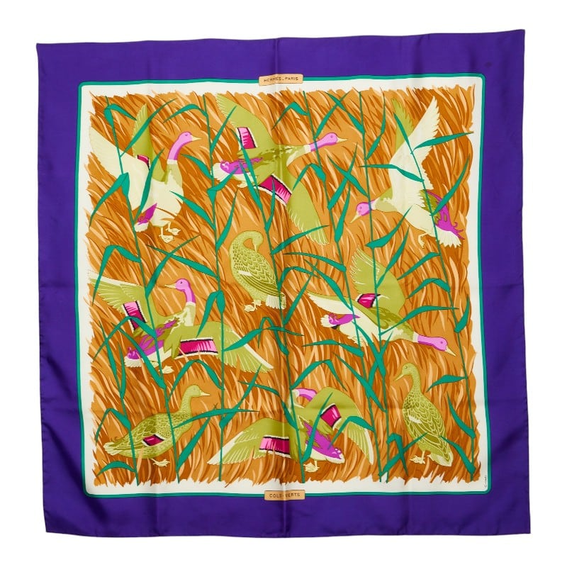 エルメス COLS VERTS マガモ 鴨 鳥 スカーフ パープル 紫 ベージュ シルク レディース HERMES 【中古】