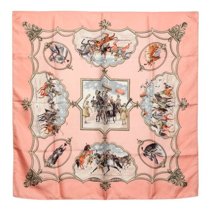 エルメス カレ90 LES CHEVAUX DES MOGHOLS ムガル王朝の馬 スカーフ ピンク マルチカラー シルク レディース HERMES 【中古】